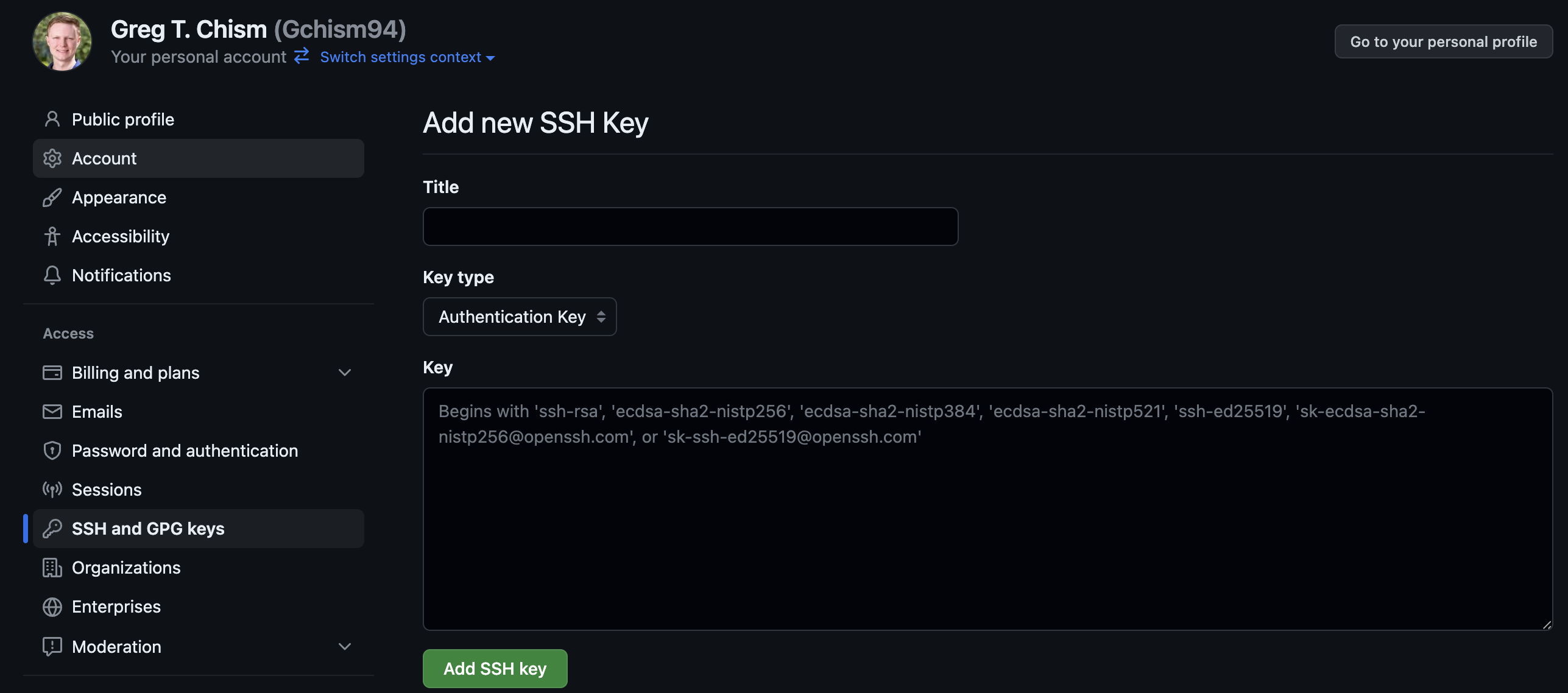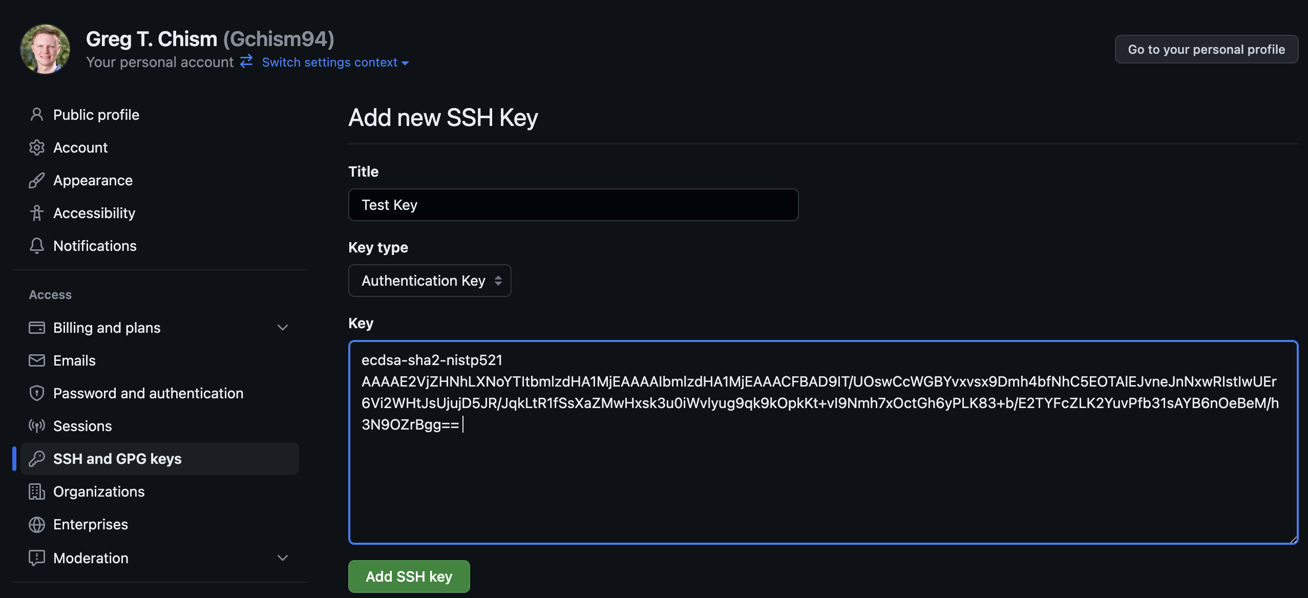 Once finished, you can click the green Add SSH key button. This key should now show in the list of GitHub SSH keys on https://github.com/settings/keys.