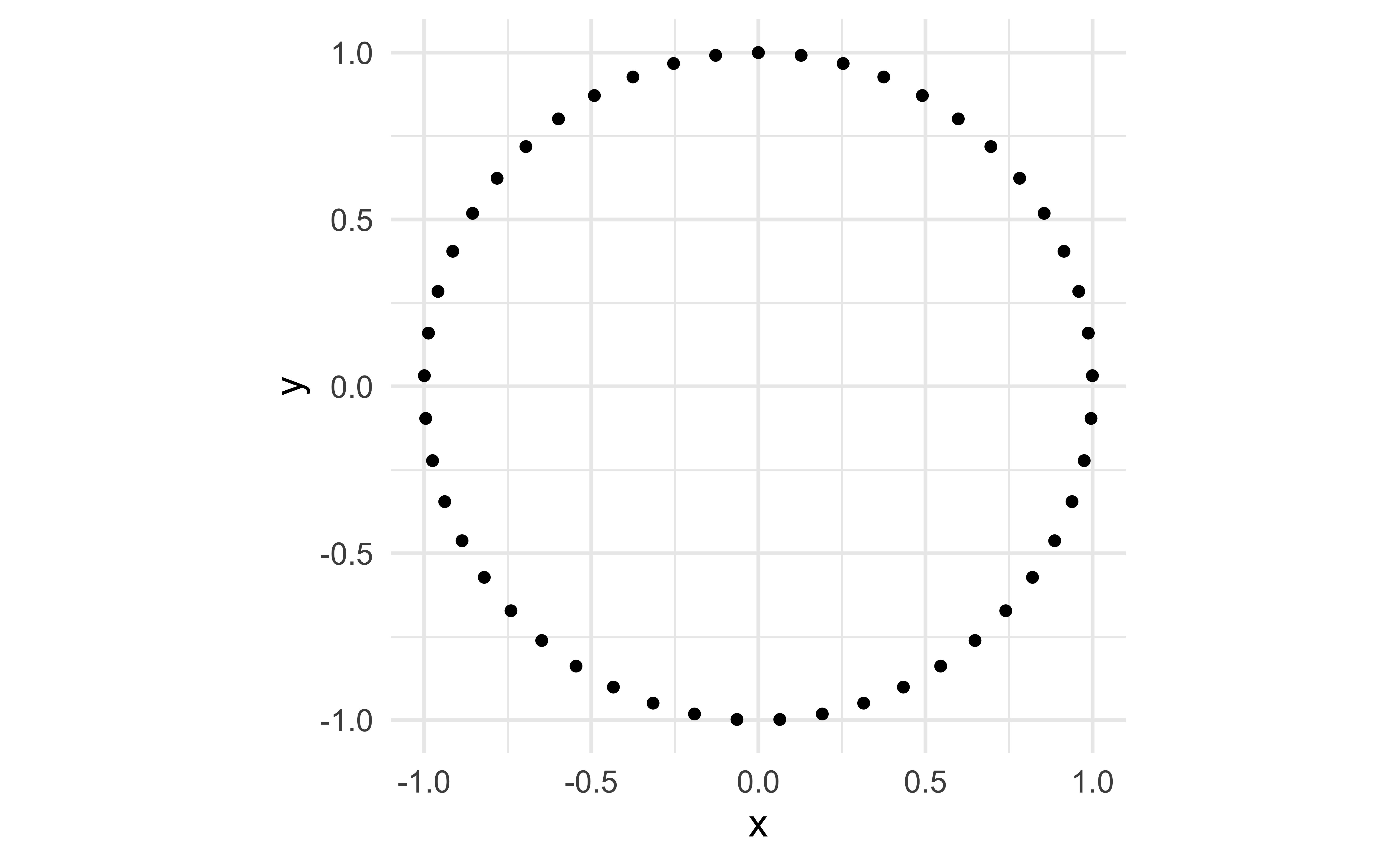 # make a circle of pointst <-seq(0, 2* pi, length.out =50)x <-sin(t)y <-cos(t)df <-tibble(t, x, y)# plot a circle of pointsggplot(df, aes(x, y)) +geom_point() +coord_equal()