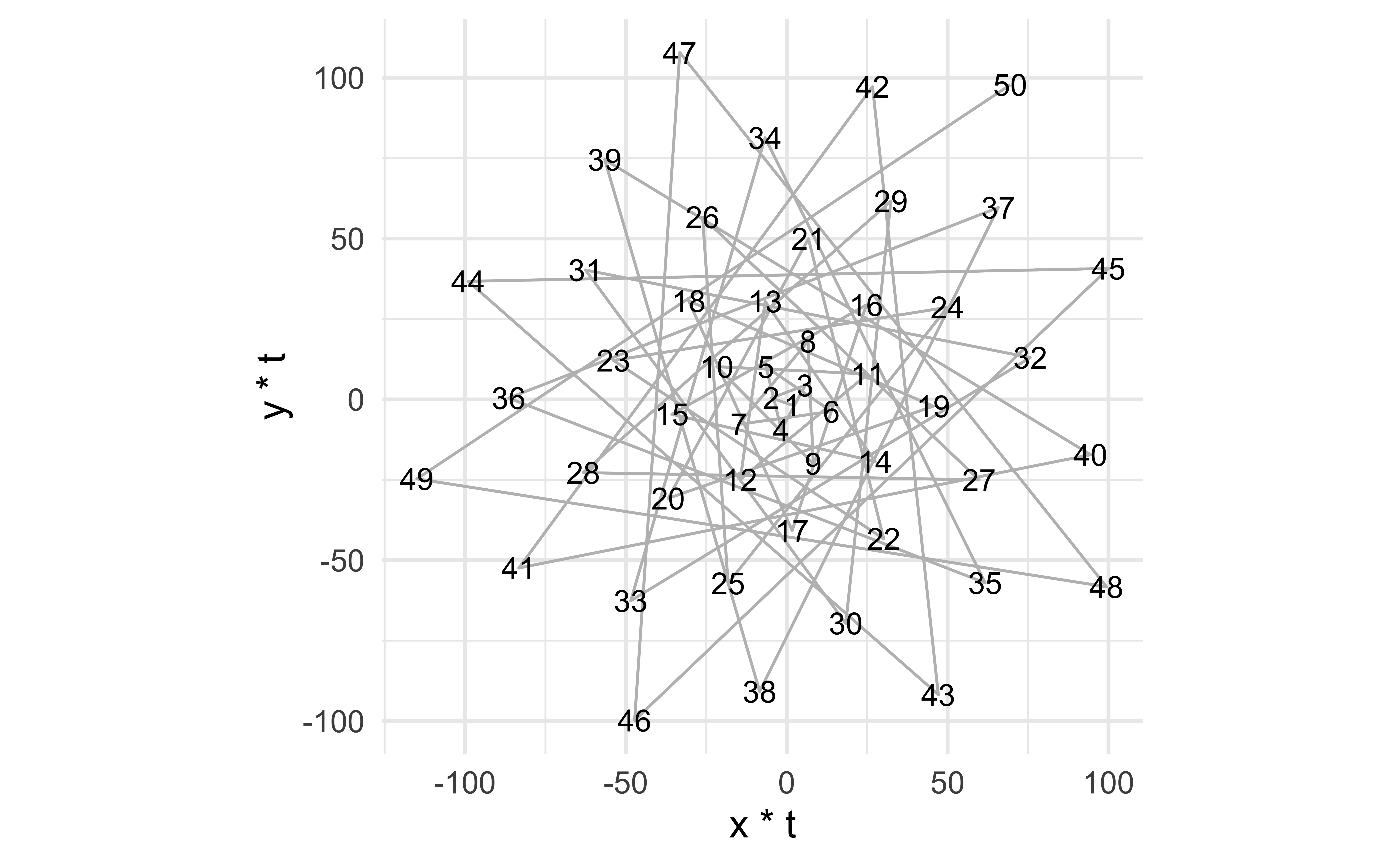 # set golden angleangle <- pi * (3-sqrt(5))# set number of pointspoints <-50# make data framedf <-tibble(i =1:points,t = (1:points) * angle,x =sin(t),y =cos(t))# plot points in a spiralggplot(df, aes(x = x * t, y = y * t)) +geom_path(color ="gray") +geom_text(aes(label = i)) +coord_equal()# set golden angleangle <- pi * (3-sqrt(5))# set number of pointspoints <-50# make data framedf <-tibble(i =1:points,t = (1:points) * angle,x =sin(t),y =cos(t))# plot points in a spiralggplot(df, aes(x = x * t, y = y * t)) +geom_path(color ="gray") +geom_text(aes(label = i)) +coord_equal()# set golden angleangle <- pi * (3-sqrt(5))# set number of pointspoints <-50# make data framedf <-tibble(i =1:points,t = (1:points) * angle,x =sin(t),y =cos(t))# plot points in a spiralggplot(df, aes(x = x * t, y = y * t)) +geom_path(color ="gray") +geom_text(aes(label = i)) +coord_equal()# set golden angleangle <- pi * (3-sqrt(5))# set number of pointspoints <-50# make data framedf <-tibble(i =1:points,t = (1:points) * angle,x =sin(t),y =cos(t))# plot points in a spiralggplot(df, aes(x = x * t, y = y * t)) +geom_path(color ="gray") +geom_text(aes(label = i)) +coord_equal()# set golden angleangle <- pi * (3-sqrt(5))# set number of pointspoints <-50# make data framedf <-tibble(i =1:points,t = (1:points) * angle,x =sin(t),y =cos(t))# plot points in a spiralggplot(df, aes(x = x * t, y = y * t)) +geom_path(color ="gray") +geom_text(aes(label = i)) +coord_equal()