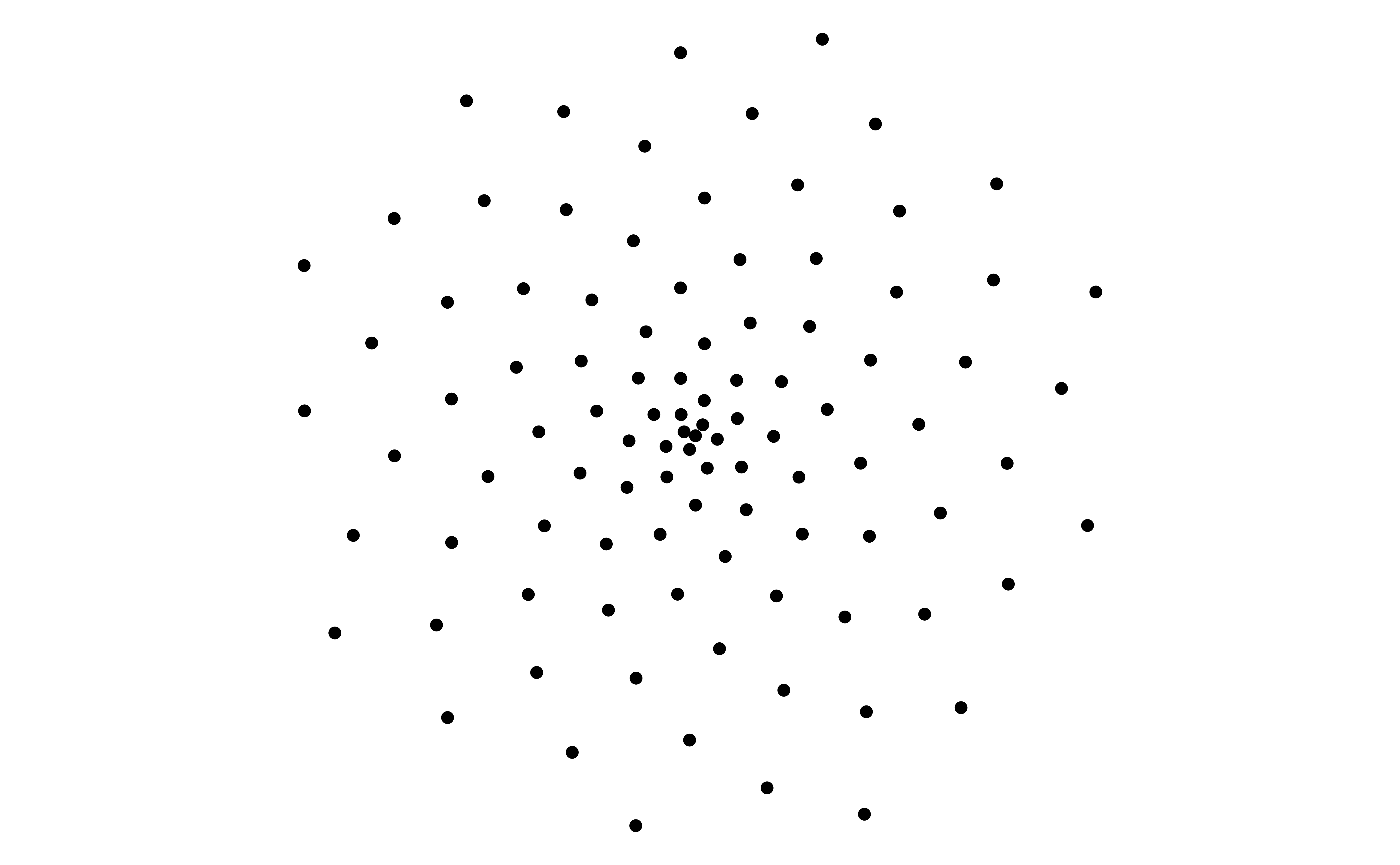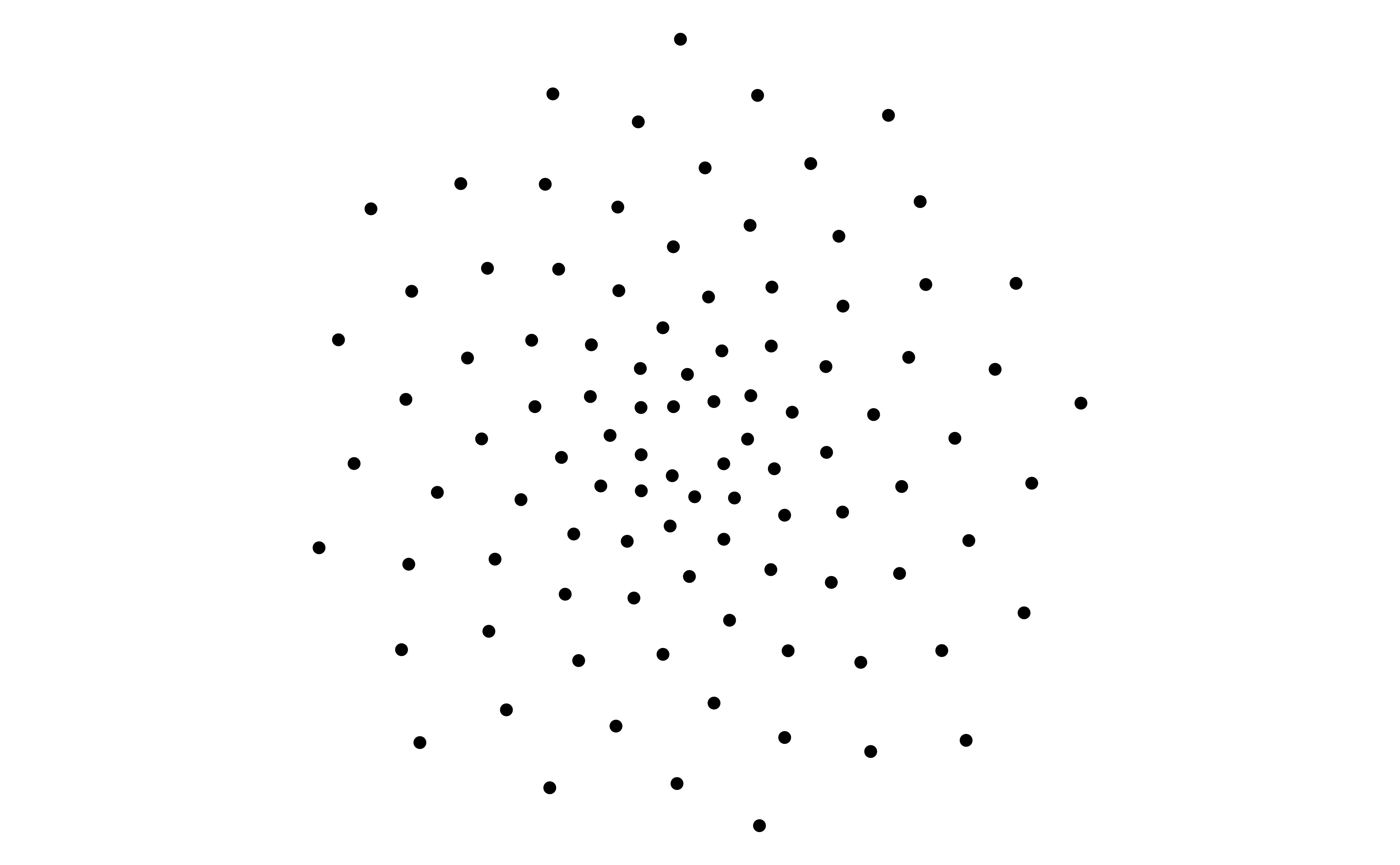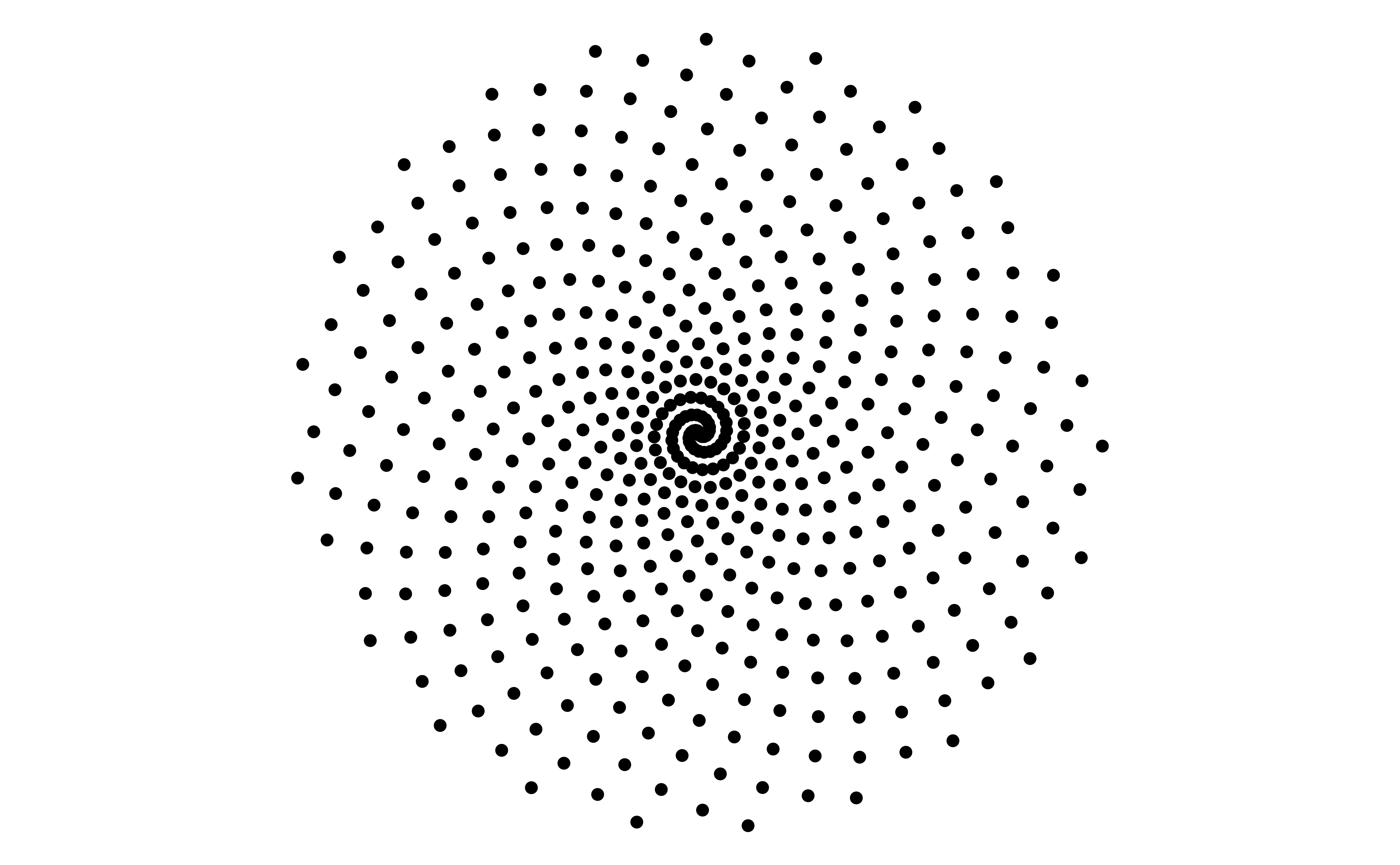 # set golden angleangle <- pi * (3-sqrt(5))# set number of pointspoints <-100# make data framedf <-tibble(i =1:points,t = (1:points) * angle,x =sin(t),y =cos(t))# plot points in a spiralggplot(df, aes(x = x * t, y = y * t)) +geom_point() +coord_equal() +theme_void()# set golden angleangle <- pi * (3-sqrt(5))# set number of pointspoints <-100# make data framedf <-tibble(i =1:points,t = (1:points) * angle,x =sin(t),y =cos(t))# plot points in a spiralggplot(df, aes(x = x * t, y = y * t)) +geom_point() +coord_equal() +theme_void()