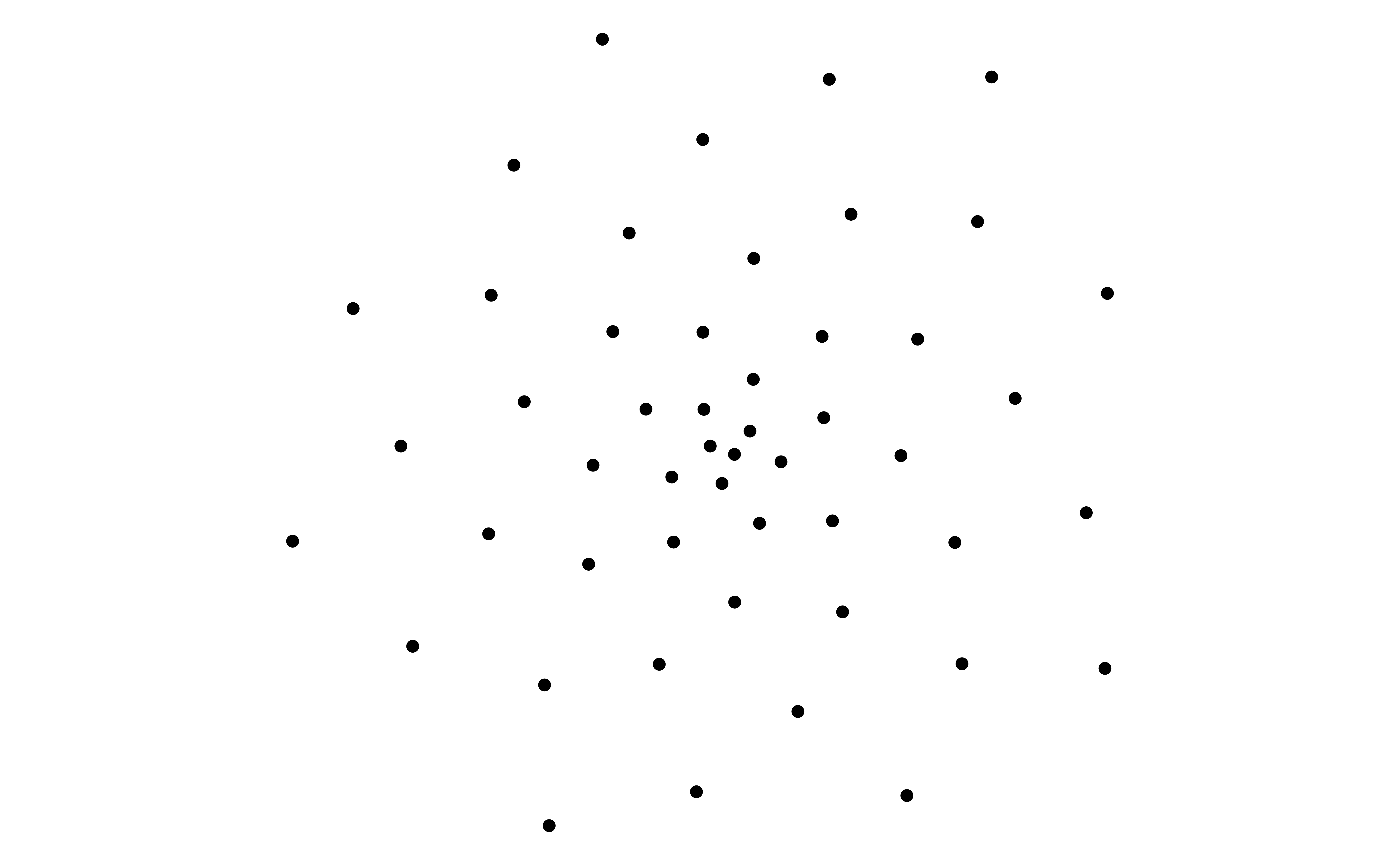 # set golden angleangle <- pi * (3-sqrt(5))# set number of pointspoints <-50# make data framedf <-tibble(i =1:points,t = (1:points) * angle,x =sin(t),y =cos(t))# plot points in a spiralggplot(df, aes(x = x * t, y = y * t)) +geom_point() +coord_equal() +theme_void()# set golden angleangle <- pi * (3-sqrt(5))# set number of pointspoints <-50# make data framedf <-tibble(i =1:points,t = (1:points) * angle,x =sin(t),y =cos(t))# plot points in a spiralggplot(df, aes(x = x * t, y = y * t)) +geom_point() +coord_equal() +theme_void()