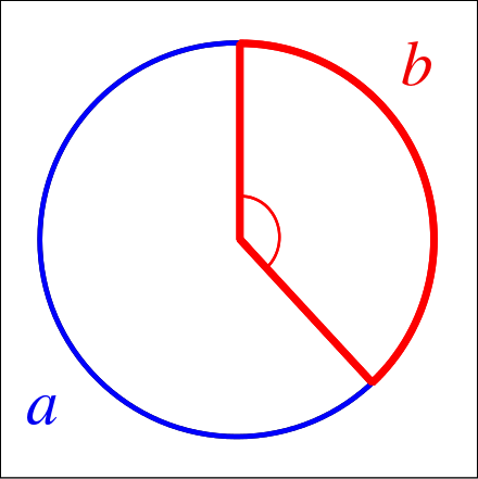 The golden angle is the angle subtended by the smaller (red) arc when two arcs that make up a circle are in the golden ratio.